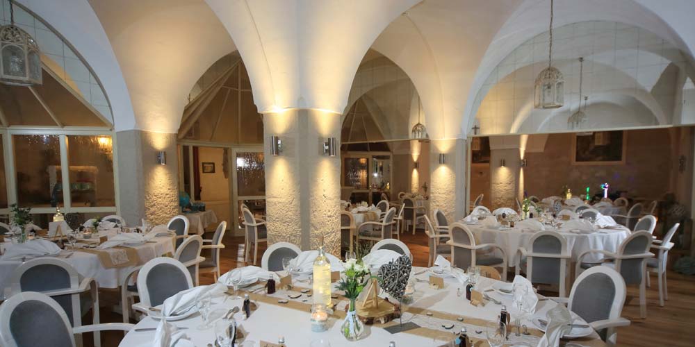In unserem "Spiegelsaal" wie in liebevoll die Ebracher nennen, können wir den "Wintergarten" und die "Orangerie" zu einem großem Raum zusammenfügen. Die alten Säulen dominieren das klösterliche Ambiente.