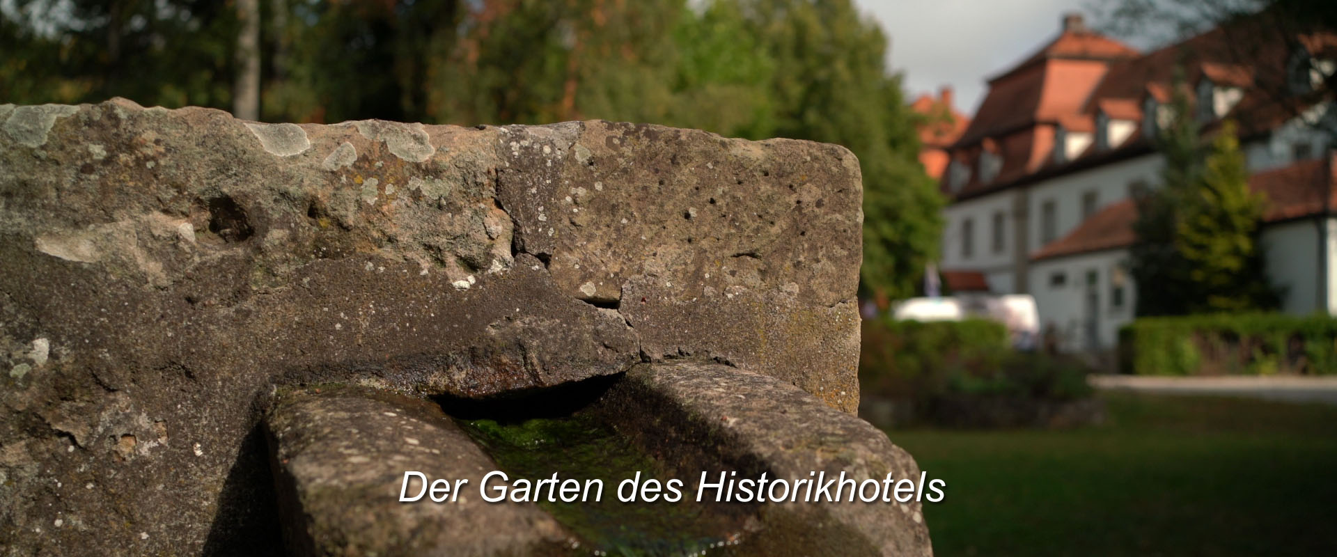 Dort wo in vergangenen Zeiten der Viehof von 4 Seiten das Areal eingrenzte, ist heute ein kleiner naturbelassener Garten mit altem Baumbestand. Das Wasser der Ebrach fließt hier unterirdisch und speißt die Brunnen, welche mit ihrem beruhigenden Plätschern die Hintergrundmusik liefern.